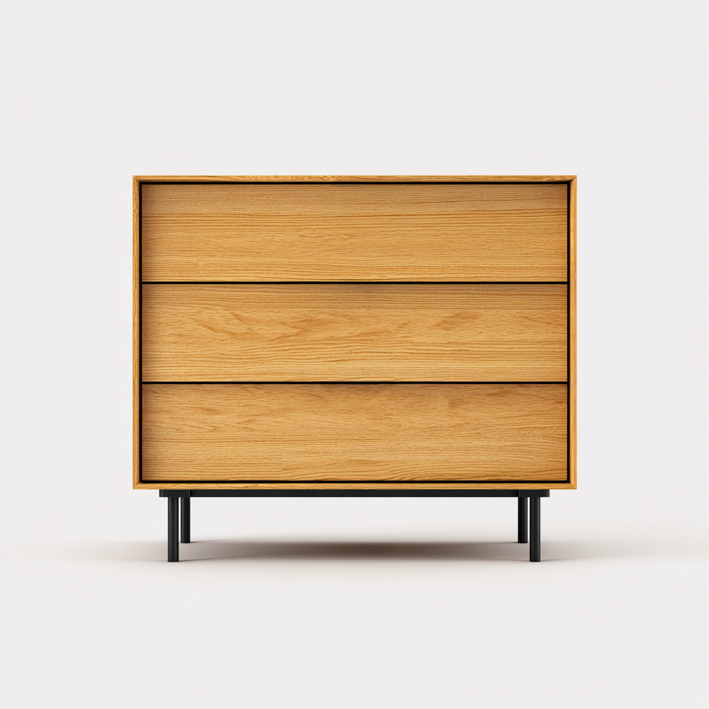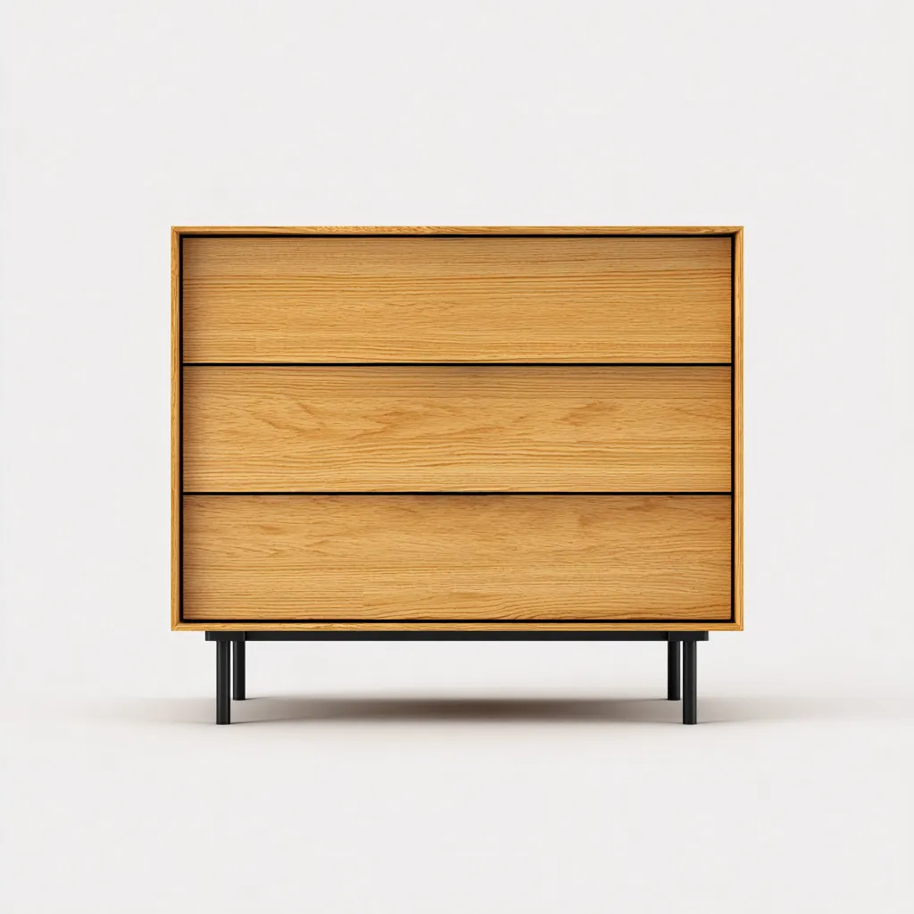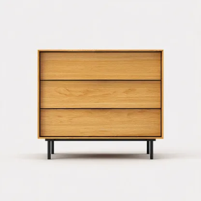 Cette commode au design moderne se caractérise par des lignes épurées et une finition bois naturel chaleureuse. Elle s'intègre facilement dans une chambre et offre une solution de rangement fonctionnelle, adaptée à un usage quotidien.