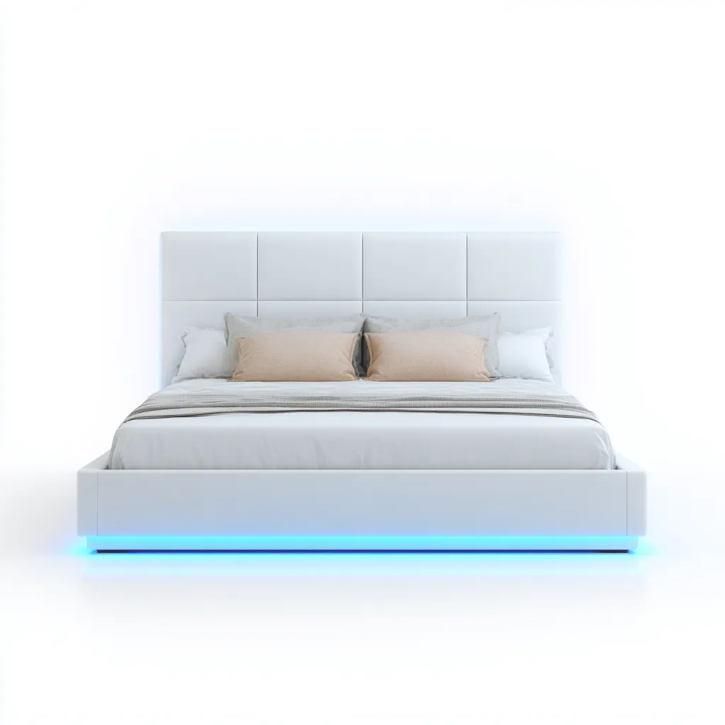 L'éclairage LED intégré à la base du lit apporte une touche décorative et une lumière d'ambiance douce. La tête de lit capitonnée offre un confort appréciable pour s'adosser lors de la lecture ou du repos.