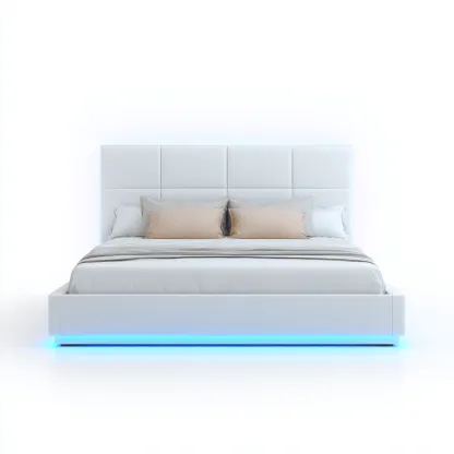 Ce lit double au style contemporain se distingue par ses lignes épurées et son éclairage LED intégré, créant une atmosphère moderne et apaisante dans la chambre. Sa finition blanche apporte une sensation de clarté et s'adapte facilement à différents styles d'intérieur.